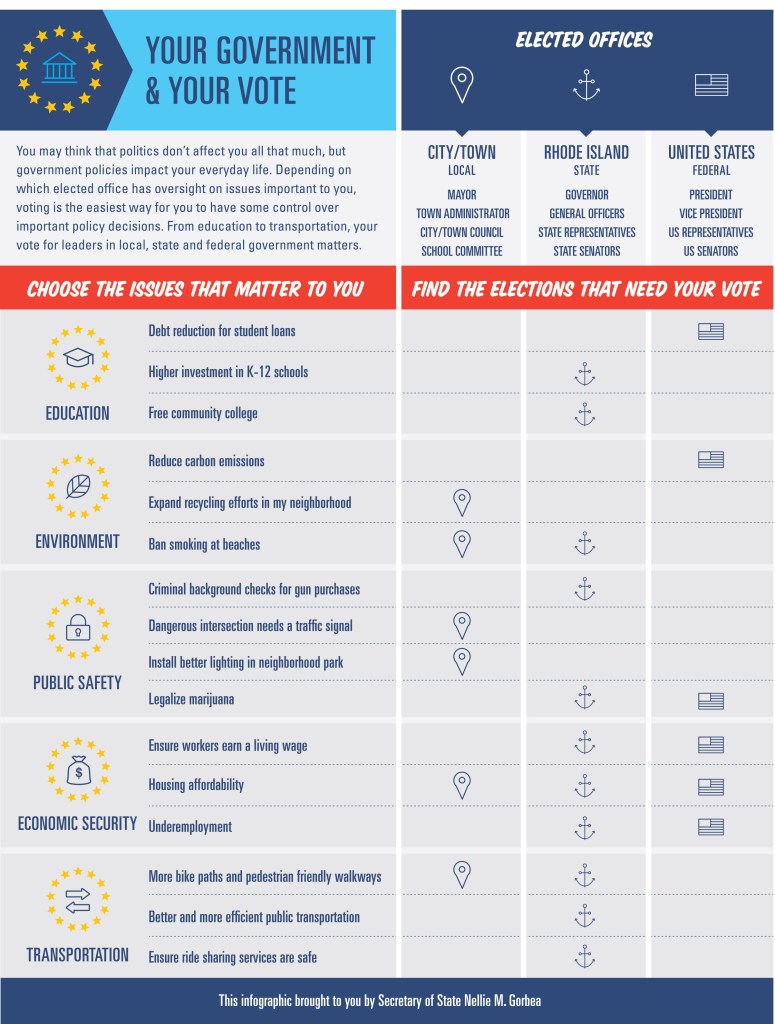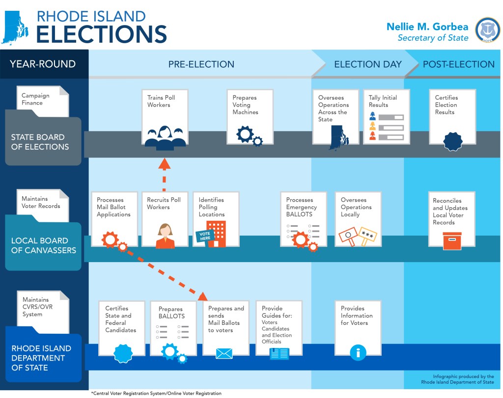 Elections in Rhode Island are administered by two distinct state entities and the local cities and towns. I developed the concept of this infographic to delineate the specific functions of each entity involved. This helped local media professionals understand who to call with specific inquiries.